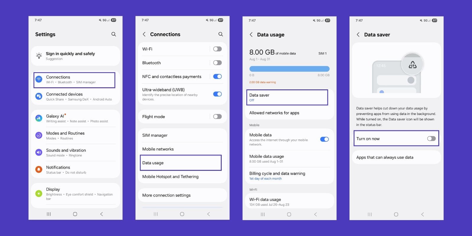 For Android: Go to Settings > Network & Internet or Connections > Data Usage > Data Saver and switch it on.