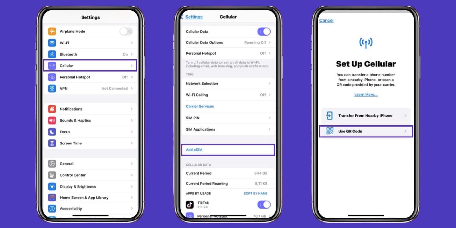 Open Settings > Cellular > Add eSIM.